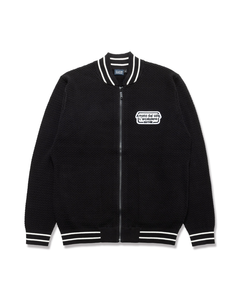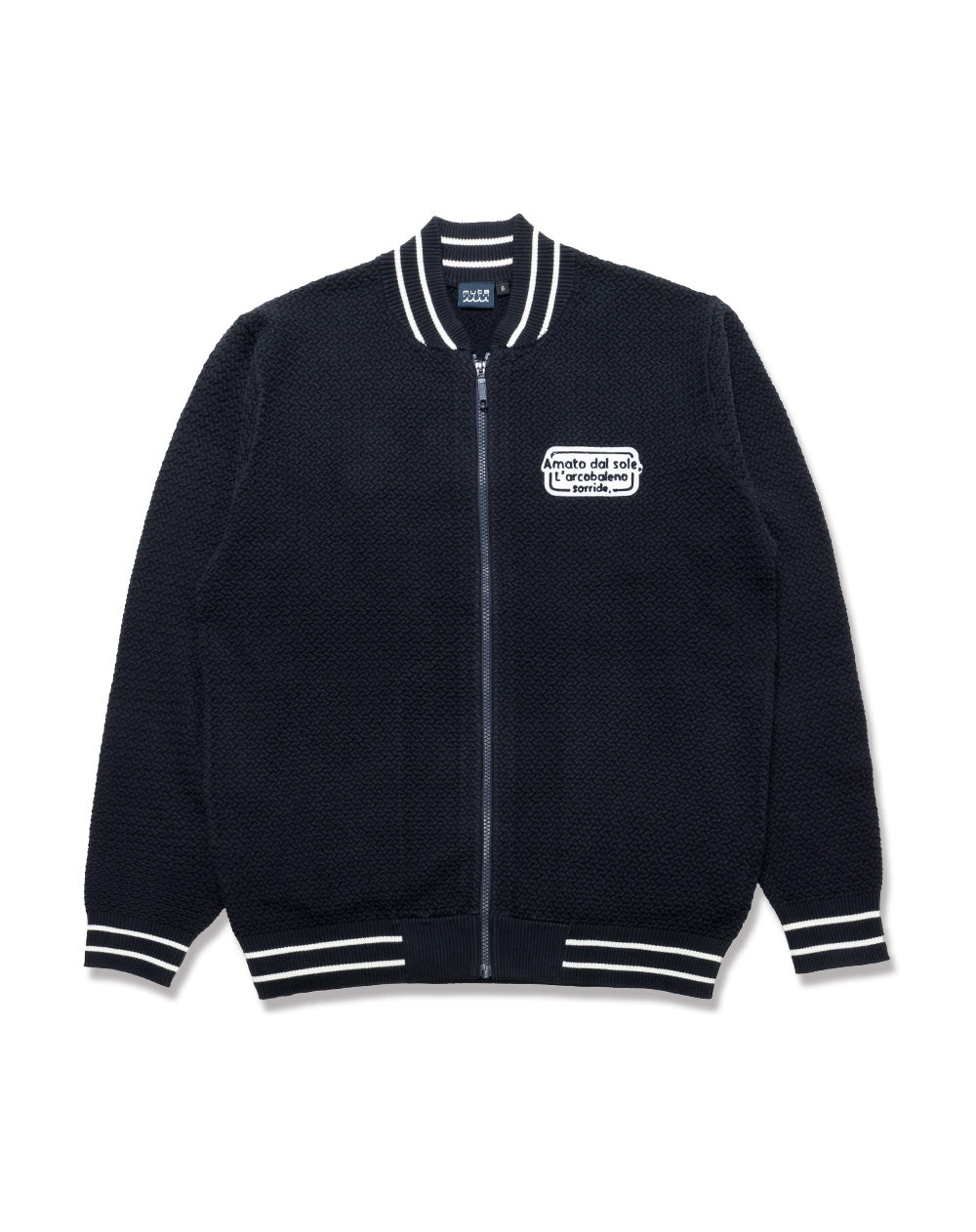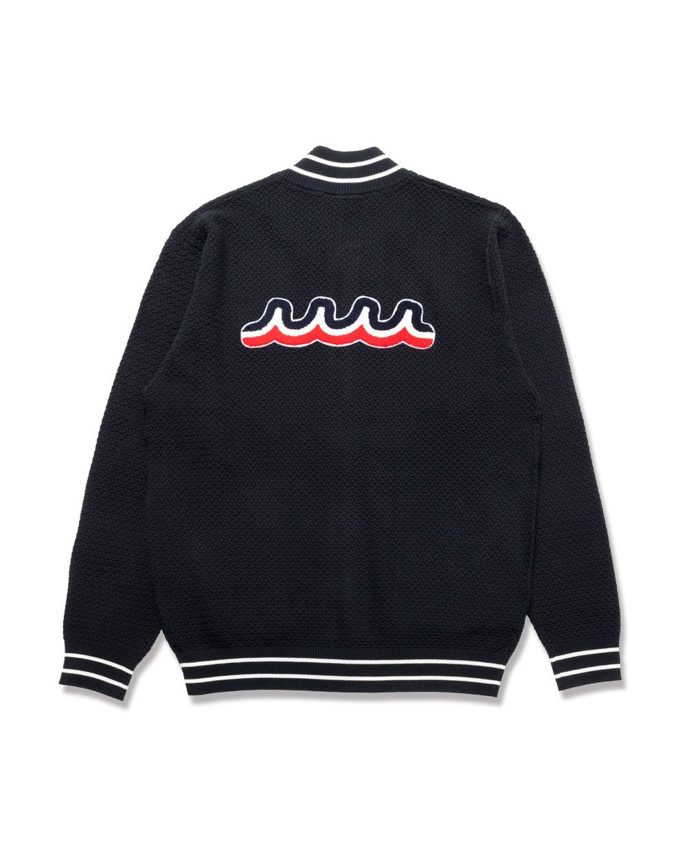 こだわりの編み地と遊び心あるワッペンデザインが存在感のあるニットブルゾン。