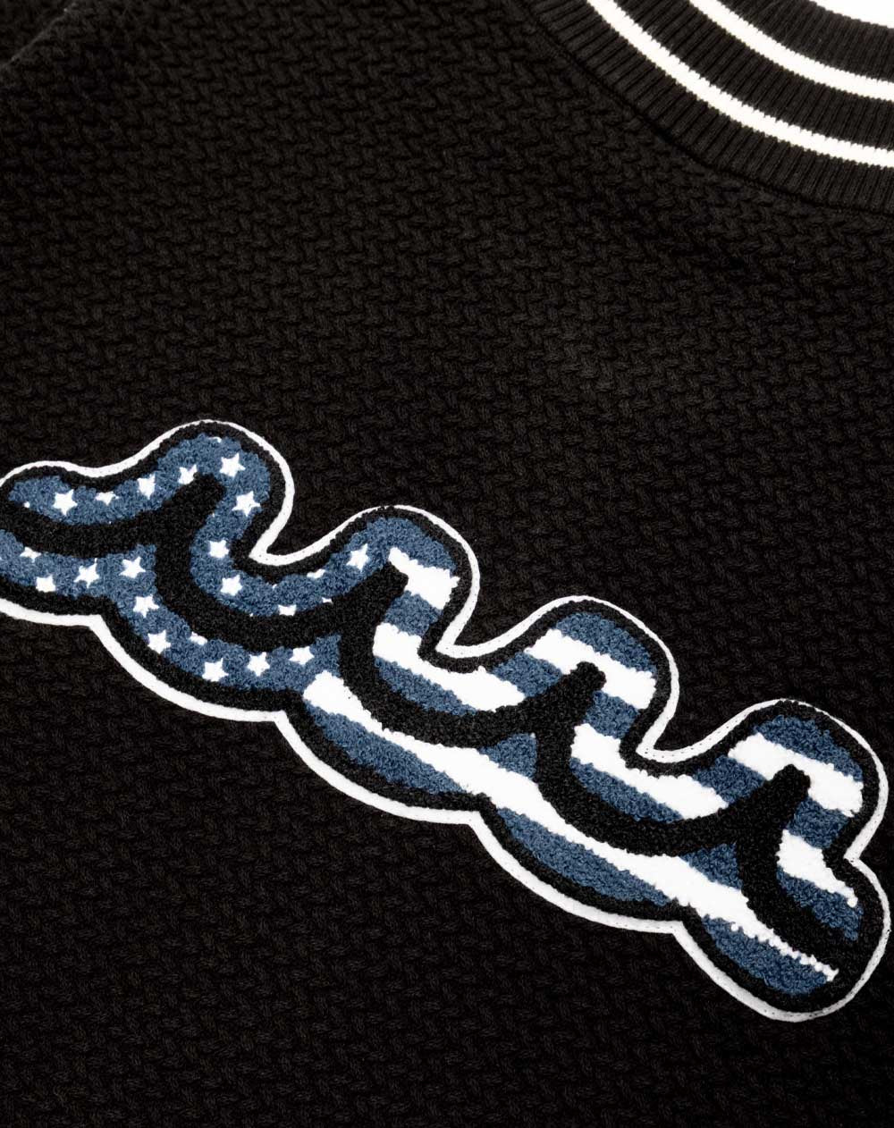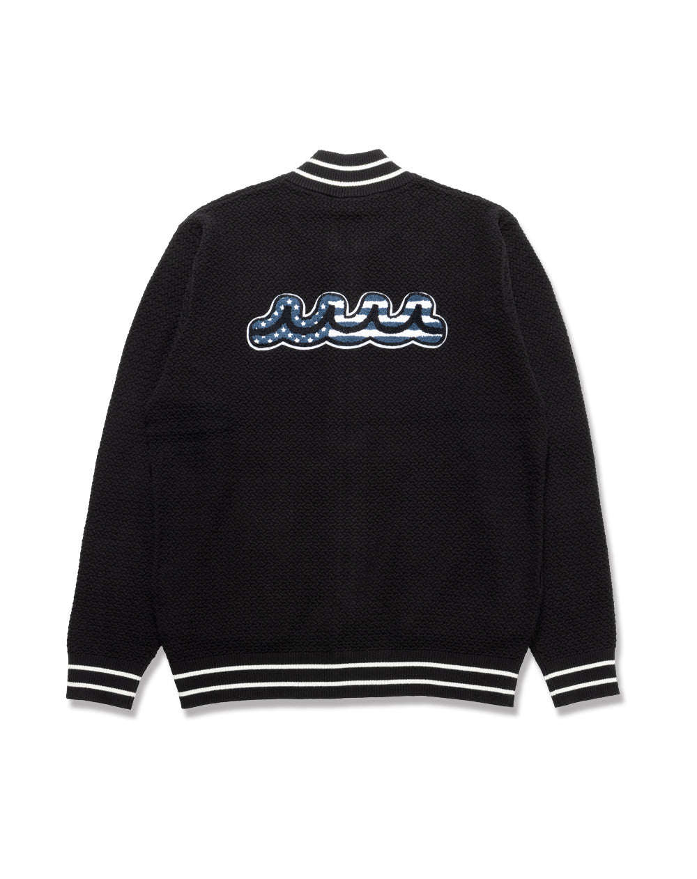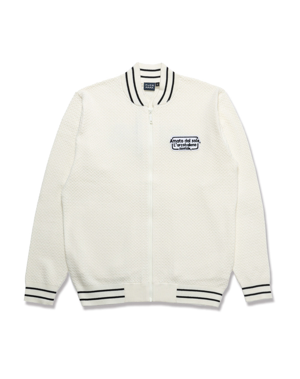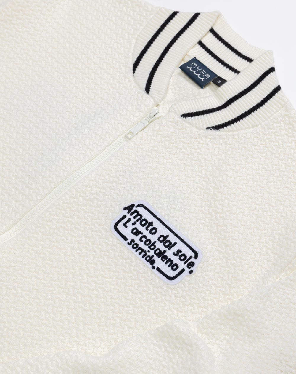 こだわりの編み地と遊び心あるワッペンデザインが存在感のあるニットブルゾン。